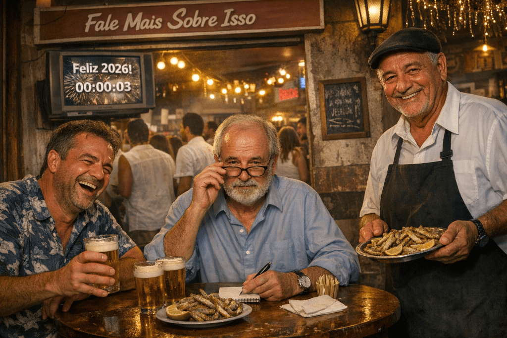 Estávamos longe dos palcos oficiais. Nada de Gil distribuindo alegria em Copacabana ou Anitta tentando explicar o Brasil em coreografias de 15 segundos. Ali, o espetáculo era o de chope com colarinho de dois dedos e um país inteiro tentando virar o ano sem virar meme internacional — ou, no mínimo, sem ser preso com passaporte falso.